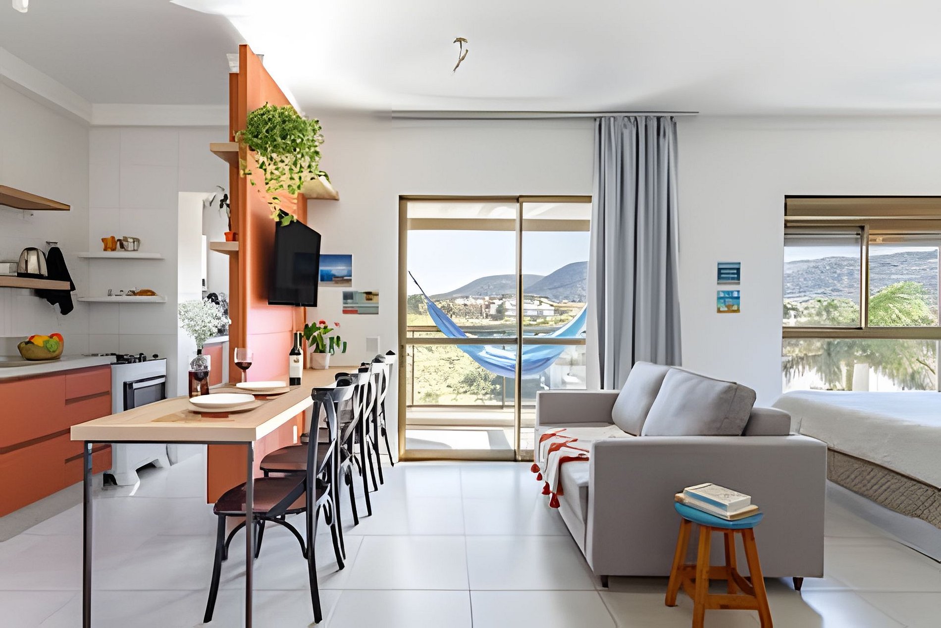 Studio amplo, arejado e bem iluminado no coração da Avenida Campeche, acesso ao Novo Campeche. Ideal para acomodar de 2 a 3 pessoas confortavelmente. Mobiliado com cama tamanho queen, armário para armazenar seus itens durante a estadia. Sofá cama retrátil amplo e confortável, Smart TV 43' nova, acesso à streamings ou também canais abertos por meio de uma antena externa. A TV está instalada na parede e pode ser vista da cama ou do sofá. Mesa de trabalho com cadeira ergonômica que foi incorporada pensando nos feedbacks dos hóspedes que fazem home office. Ambiente possui ar condicionado que refresca todo o local, além de ventilador portátil. Banheiro arejado, possui ducha deliciosa com aquecimento a gás e disponibilizo sabonete líquido para as mãos na pia. Na cozinha, balcão com 4 cadeiras para refeições, fogão com forno, microondas, geladeira duplex. Torneira da pia com água fria filtrada. Copos, taças e coador/filtro para preparo de café. Ferro de passar e secador de cabelos estão disponíveis durante a estadia. Todos os cômodos possuem janelas (inclusive banheiro) permitindo espaço bastante arejado. Vista livre para o morro com incrível por do sol, não há qualquer edificação em frente à varanda. Um super diferencial que garante tranquilidade extra.