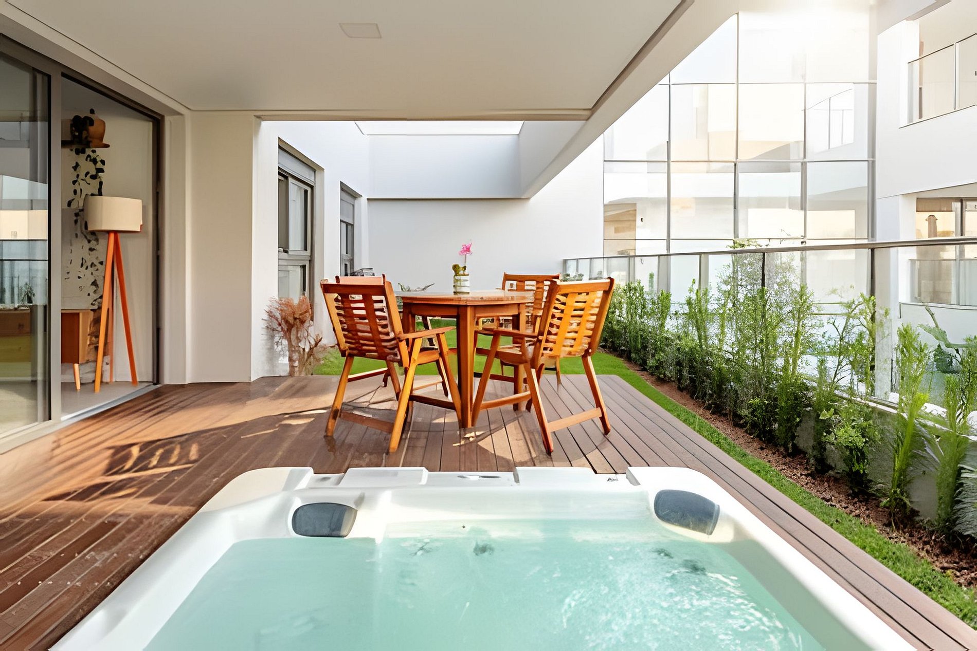 A jacuzzi aquecida com o jardim privativo e a vista lateral para o mar criam o cenário perfeito para dias inesquecíveis — com o privilégio de acesso direto à areia e infraestrutura completa de lazer.
