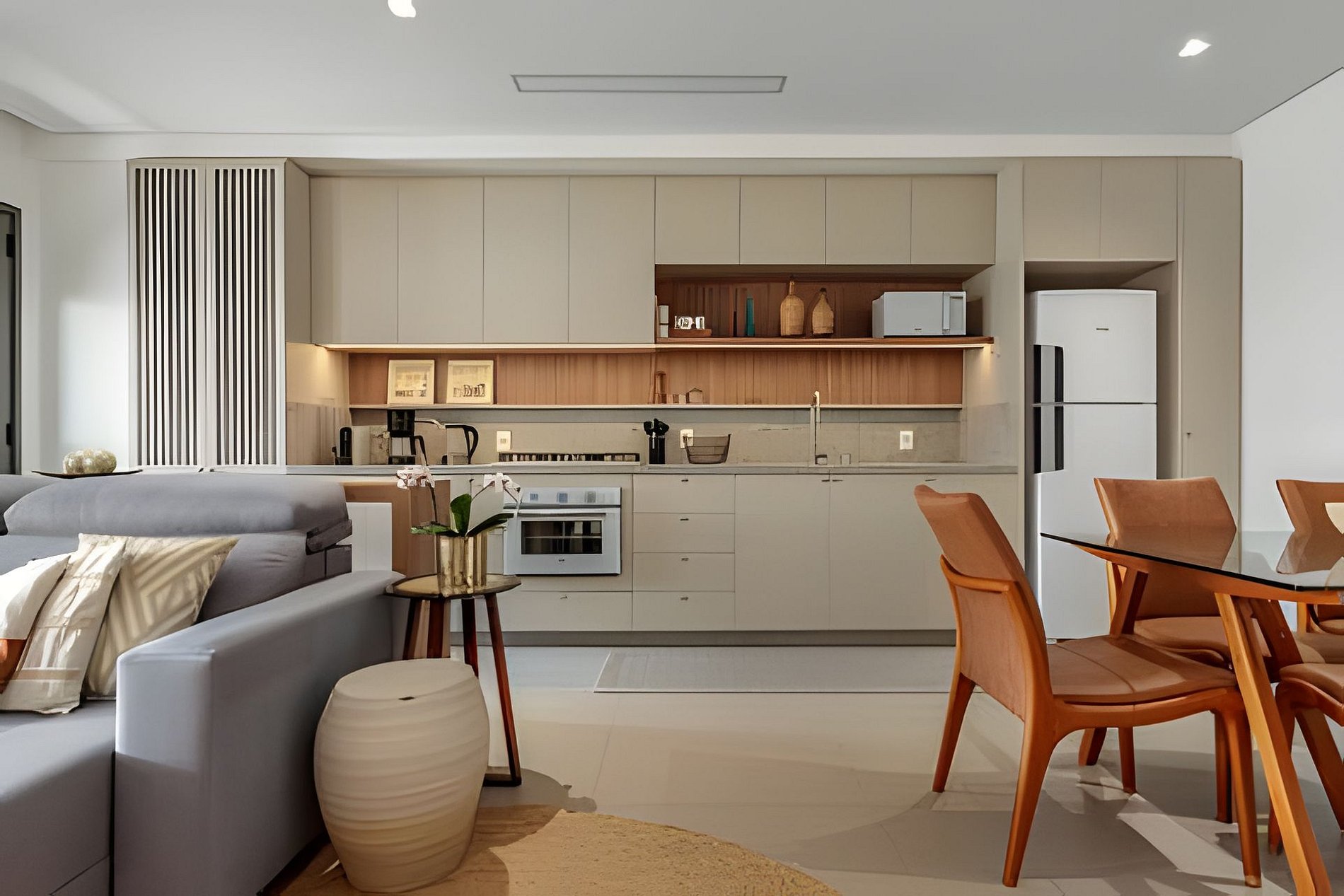 No apartamento, a sala integrada à cozinha é funcional e bem equipada, com utensílios completos: forno, cooktop, micro-ondas, cafeteira, chaleira elétrica e geladeira duplex.