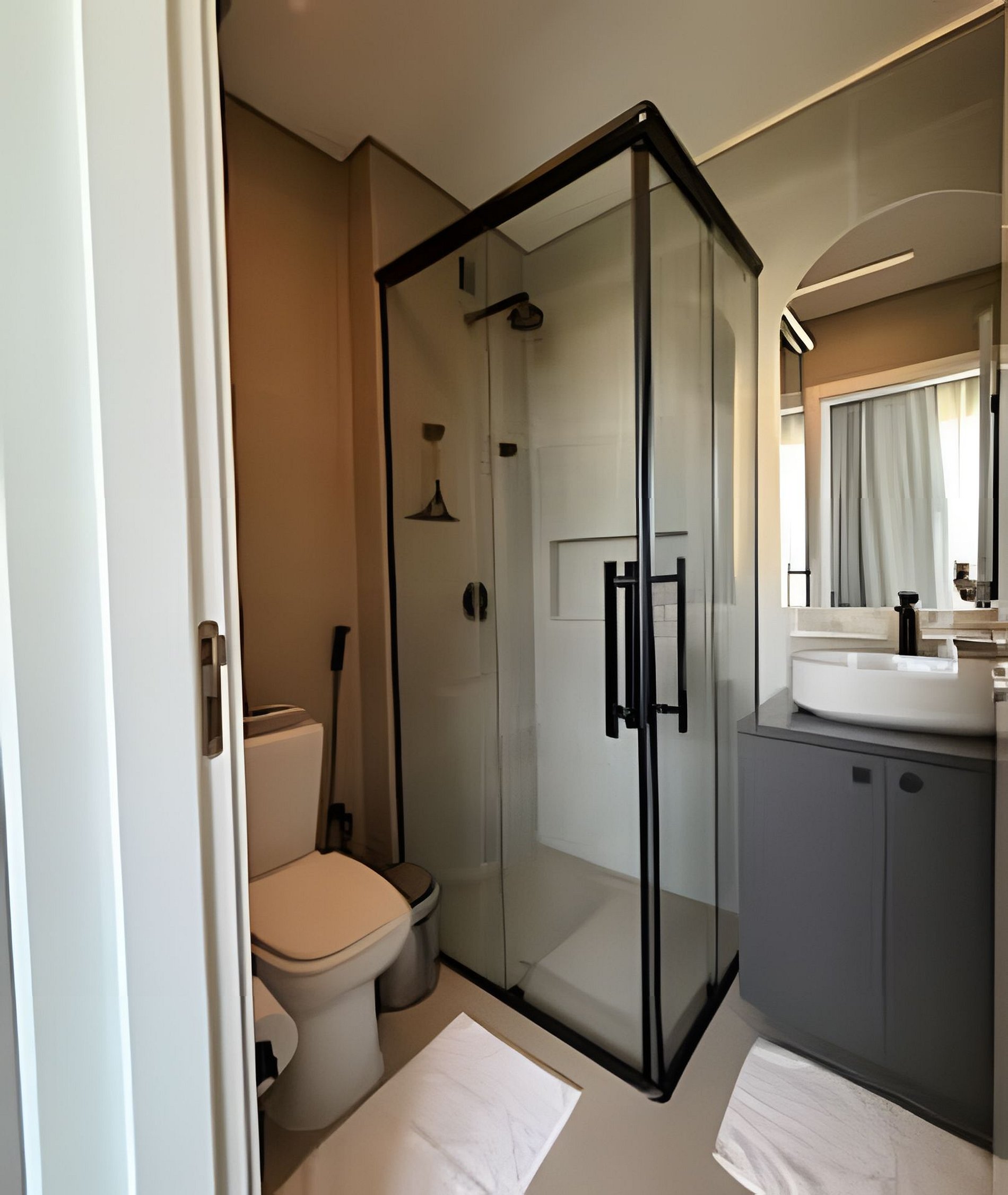 Banheiro moderno e elegante, com meia luz aconchegante, acabamento refinado e aquecimento a gás, oferecendo conforto em qualquer época do ano.